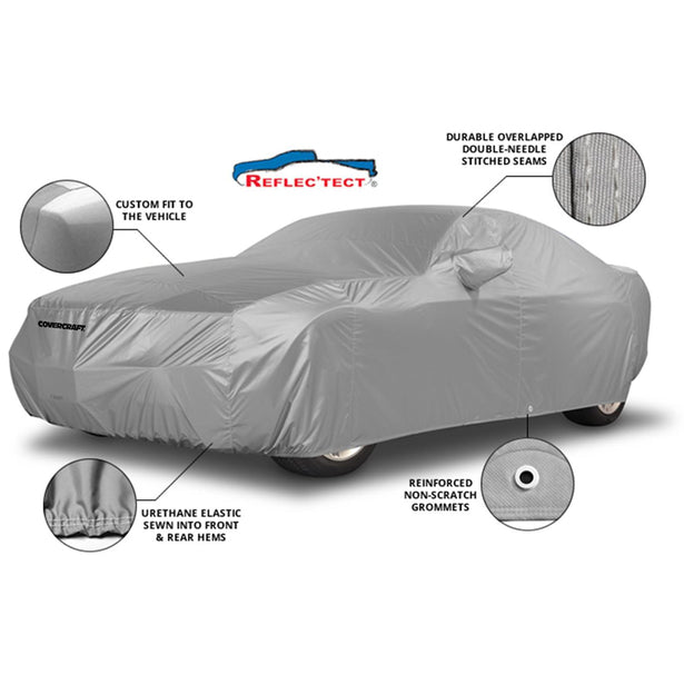Protect your vehicle from damaging UV rays and keep your interior cool with the Custom Reflec'tect® Car Cover from Covercraft. Offered in a stylish silver color, this custom cover is designed to fit your vehicle perfectly. Its breathable material allows moisture and heat to escape, making it ideal for sunny climates. With its sleek, nostalgic look and superior functionality, it's the perfect way to shield your vehicle from the elements and mild-to-moderate sunlight.