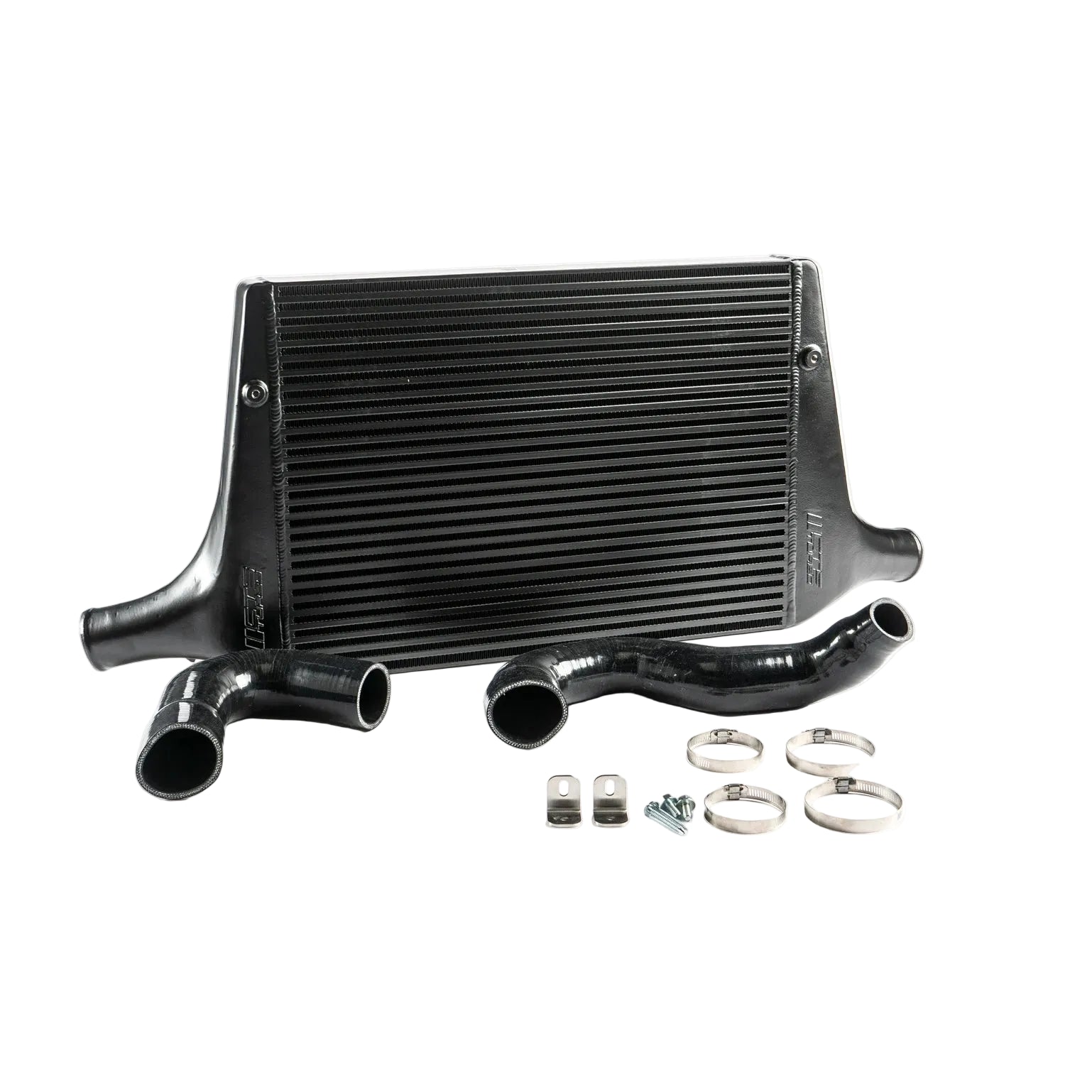 This giant intercooler core is almost 2 times larger than stock but does not cause a noticeable pressure drop, 1-2psi was measured. Cast aluminum end tanks attach to our high-flow silicon hoses seamlessly to ensure a boost-leak free fit that will last! This part meets our extensive quality control and pressure testing.