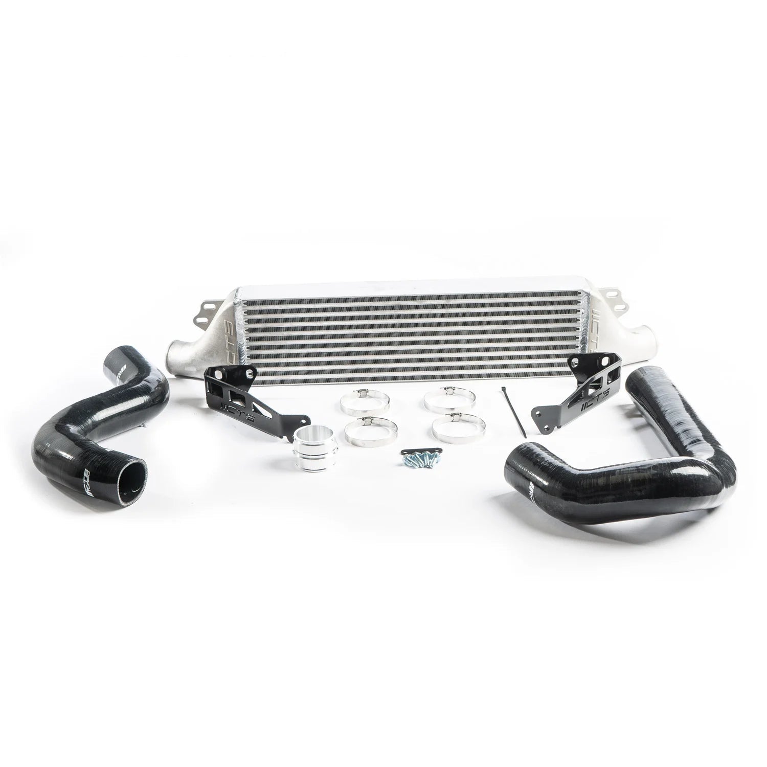 The kit incorporates a bar and plate intercooler core, recognized for its superior heat dissipation characteristics and durability. The cast aluminum end tanks further facilitate efficient airflow, contributing to the overall cooling performance. The design eliminates the need for any trimming during installation, ensuring a seamless fit.