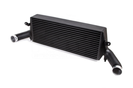 The TTRS core is a huge 640x250x100 and of bar and plate design. This gives it a huge 56% more surface area than stock, and an even more impressive 94% increase in volume. The end tanks are made with integrated pipes in order to retain the stock boost hoses, though you can also replace the hoses with our FMKT024 boost hose set if you so wish. Just like on the 8V chassis, we supply a genuine Audi TTRS crash bar which we modify in house in order to accept the new larger core, then finish both the crash bar and core in our standard black crackle finish powder coat for maximum longevity.
