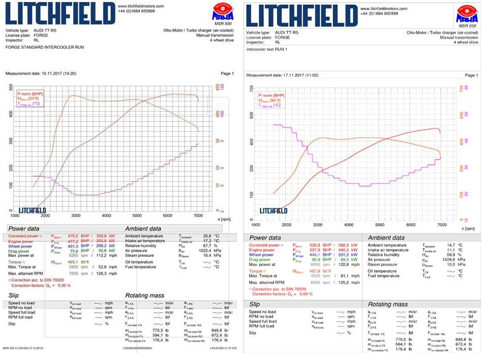 On the stage 1 car we tested on (with map and exhaust modifications), it made 470.5 bhp with a peak intake temperature of 76°C. With just this intercooler fitted and no other modifications, the same car made 520.8 bhp with a peak inlet temperature of 34°C, a gain of 50 bhp and a drop of 41°C. Gains on stage 2 mapped cars will likely be even more impressive as the stock intercooler core really starts to struggle on just stage 1 mapped cars.