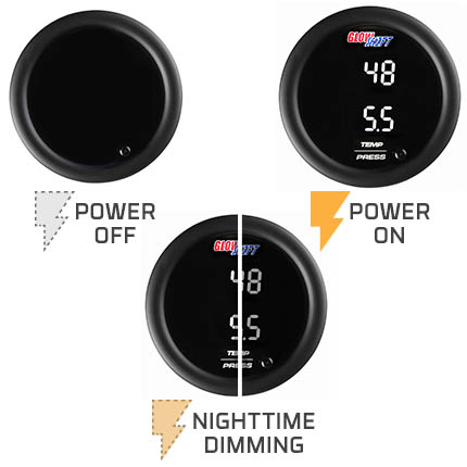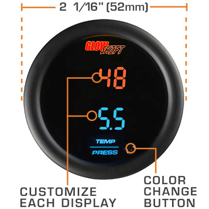 GlowShift Dual Digital Celsius Temperature and BAR Pressure Gauges deliver multiple monitoring options in one gauge. Choose from Water Temp, Transmission Temp, Oil Temp or Differential Temp settings for your Celsius temperature readings. Then select Boost, Oil Pressure or Fuel Pressure for your BAR pressure readings. The included electronic temperature and pressure sensors take care of all the hard work by keeping a close eye on changing temp and pressure levels, displaying whether they are running too high or too low.