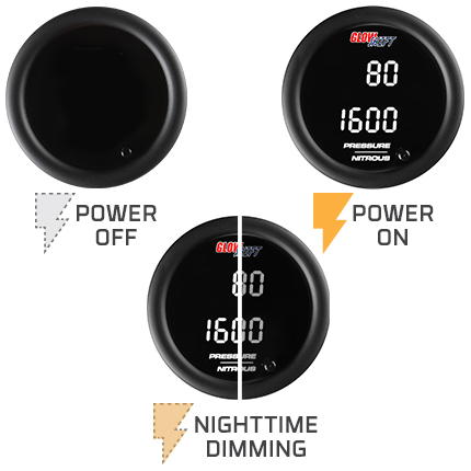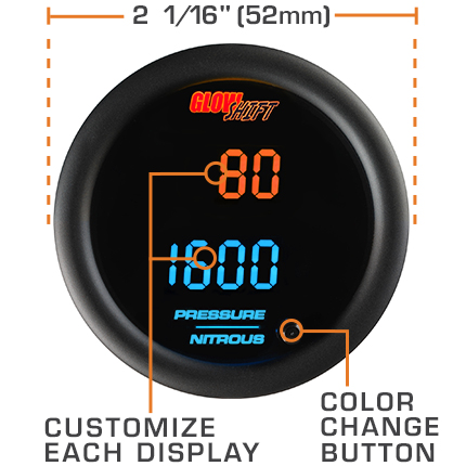 GlowShift dual digital pressure and NOS pressure combo gauges take up less space during installation and save you time by combining two critical gauges into one. You’ll have more room on the A-pillar, dash or another location when you add this combo gauge. Less wiring will also be required for connections, so you won’t have to worry about the wire clutter that sometimes comes with installing multiple gauges. Everything required for installation is provided with instructions that walk you through step by step.