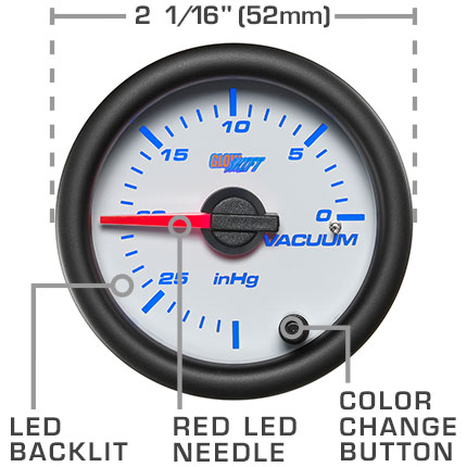 GlowShift’s White 7 Color Series Vacuum Gauge will monitor your engine's vacuum levels to ensure that your engine is performing optimally. Take accurate readings on both compression and vacuum levels from -30 to 0 inHG. This mechanically driven vacuum pressure gauge will also alert you if there are any air leaks, which could cause rough idling, poor fuel economy and increased emissions.