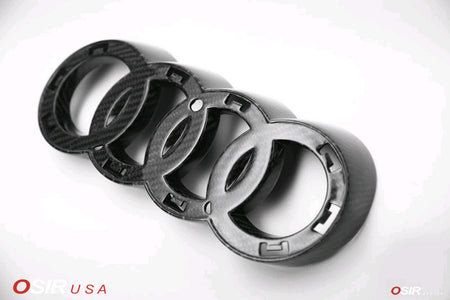 OSIR Design carbon fiber logo base support. For use with the OSIR A5 MASK, A512 MASK or any other mesh Audi grill. Reuse your existing A5 / S5 / RS 5 Audi rings. Vacuum infused premium carbon fiber with choice of a High Gloss finish or the SE Matte finish.
