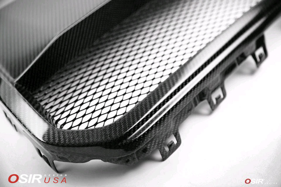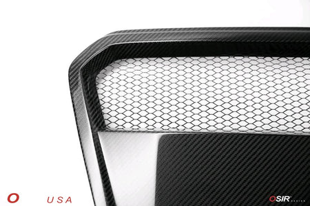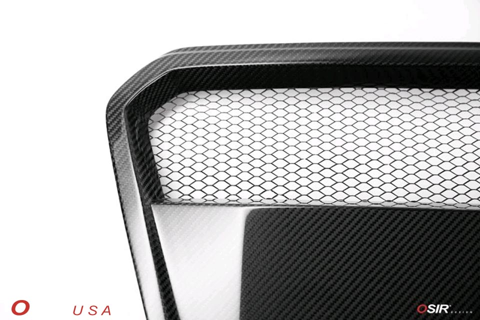 OSIR Design replacement front grille for the 2012-2015 Audi A5, A5 S-Line, S5 and RS 5 (B8.5). Vacuum infused premium carbon fiber with choice of a High Gloss finish or the SE Matte finish. Available in either weaved carbon fiber or forged carbon fiber. Comes with standard metal mesh. Shown with optional plastic RS Style Honeycomb Mesh. Shown with optional carbon fiber logo base support and OSIR Badge.