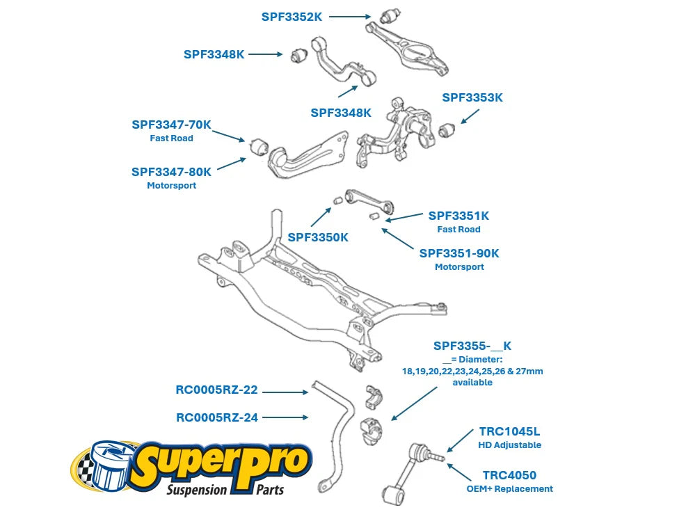 SuperPro's KIT5238RK is an all-in-one-box rear suspension upgrade that pairs well with our complete front lower control arms or any combination of front axle bushing or bushing/mount/geometry upgrades.